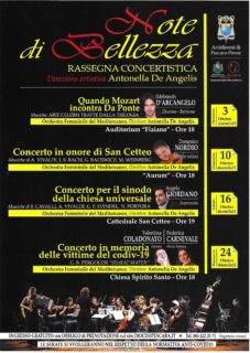 Si intitola “Note di bellezza” la rassegna concertistica, con la direzione artistica di Antonella De Angelis, ideata e promossa dall’Arcidiocesi di Pescara-Penne in collaborazione con l’Orchestra femminile del Mediterraneo e l’Assessorato alla Cultura del Comune di Pescara, patrocinata dalla stessa Amministrazione comunale pescarese: «Pensando a come ridare senso alla vita che stiamo affrontando in questo momento così difficile – premette monsignor Tommaso Valentinetti, arcivescovo di Pescara-Penne – con la direttrice De Angelis – essendo Pescara la sede di un Master internazionale per formare nuovi cantanti di lirica e musica classica – abbiamo pensato di fare quattro concerti, il primo dei quali dedicato proprio al Master, per ridare un segno di bellezza. Un caro amico mi disse che “la vita dev’essere bella, buona e felice” e poter contribuire a renderla tale è un valore aggiunto». La kermesse musicale, con ingresso gratuito, si svolgerà in quattro serate nel mese di ottobre, le quali vedranno protagoniste la musica classica, suonata dall’Orchestra femminile del Mediterraneo (composta da 25 elementi provenienti dall’Italia e dall’estero), il canto lirico – grazie alla partecipazione di grandi artisti – e la musica classica suonata da musicisti di prim’ordine.