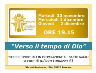 Secondo la tradizione gesuita saranno gli esercizi spirituali ignaziani – dal tema “Verso il tempo di Dio” – a preparare la comunità parrocchiale del Cristo Re a Pescara, e tutti coloro che vorranno partecipare, al Natale. Si terranno questa sera, domani sera e giovedì sera alle 19.15 nella chiesa in via del Santuario 160, al termine della santa messa vespertina, e saranno diretti da Padre Piero Lamazza.