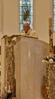 Il suo nuovo impianto, tra l’altro, è direttamente collegato alla liturgia pasquale: «Come avete visto – ricorda -, probabilmente vi siete resi conto ormai già da qualche tempo che abbiamo rinnovato il presbiterio. Questa è la prima Pasqua che celebriamo nel presbiterio rinnovato. Lo sottolineo perché l’idea di fondo, biblica e teologica, che sta dietro tutti i pezzi che sono stati rinnovati è mostrare il “giardino del Risorto”. Gesù è stato sepolto in un giardino, la tomba era in un giardino, Gesù risorge in un giardino. Se vedete l’ambone, ha un’apertura centrale che indica proprio la tomba spalancata. Ma la tomba si spalanca perché la Parola di Dio fatta carne, finalmente è libera e vola con le ali dell’aquila su tutta l’umanità. Ecco i simboli così come sono stati mostrati. Così come i fiori che sono intorno al cielo pasquale, che è il segno di Gesù vivente, e i fiori che sono intorno alla mensa eucaristica, perché Gesù vivente è presente nell’Eucaristia. Ma è presente anche dietro il presidente dell’assemblea, che ha i fiori dietro la schiena. Vi ho dato queste poche illustrazioni perché, quanto prima, faremo una pubblicazione perché questo presbiterio merita che possa essere conosciuto nella sua particolarità e nella sua bellezza».