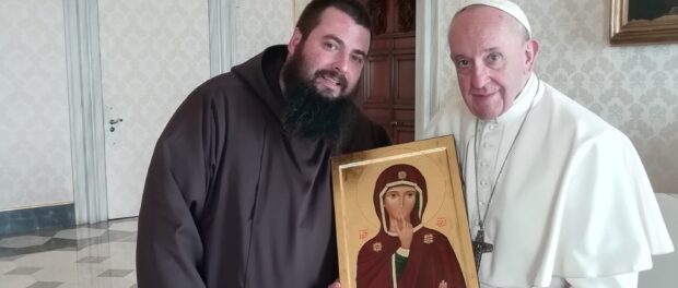 Fra Emiliano Antenucci e Papa Francesco con l'icone della Madonna del silenzio
