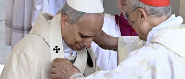 Pope Leo XIV receives the pallium by Moroccan Cardinal Dominique Mamberti during a mass for the beginning of his pontificate, in St Peter's square in The Vatican on May 18, 2025. (Photo by Filippo MONTEFORTE / AFP)