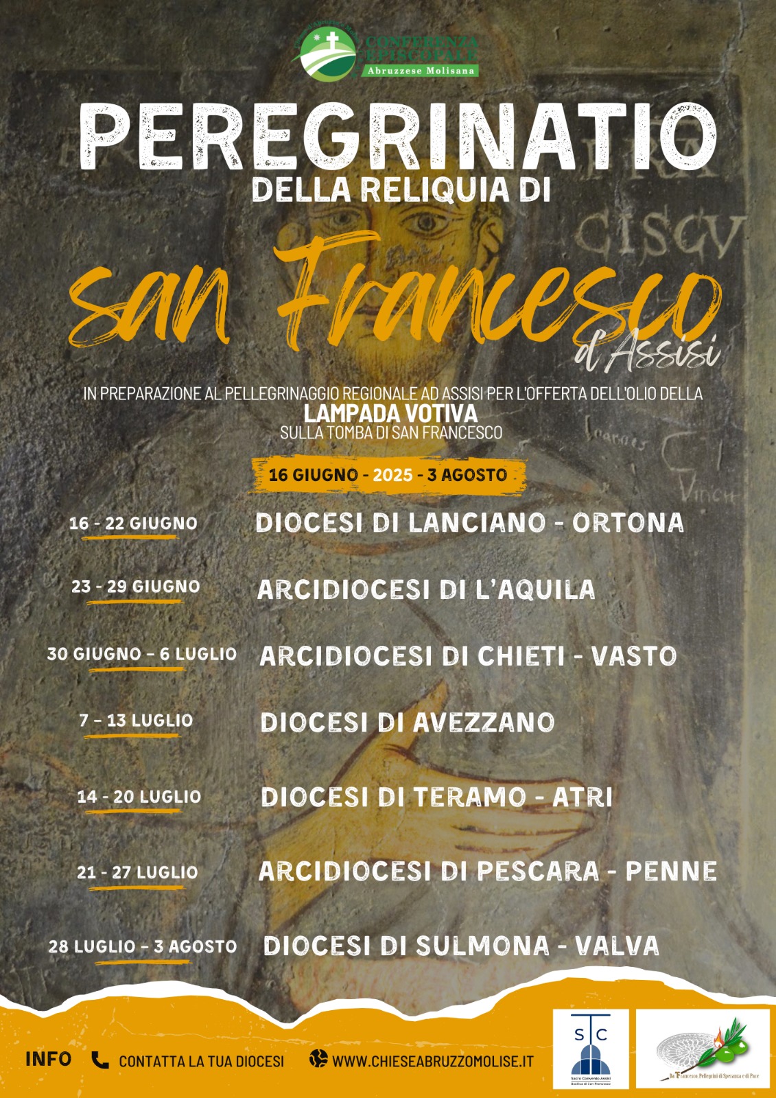 Faranno tappa anche nell’Arcidiocesi di Pescara-Penne, da lunedì 21 a domenica 27 luglio luglio 2025, le reliquie di parte del cappuccio del saio di San Francesco d’Assisi di una porzione delle sue ceneri corporee – concesse dal Sacro Convento di Assisi – nell’ambito della Peregrinatio delle reliquie nelle sette diocesi abruzzesi, promossa dal Comitato organizzatore interdiocesano – coordinato da monsignor Michele Fusco, vescovo di Sulmona-Valva – delegato dalla Conferenza episcopale abruzzese e molisana (Ceam) ad organizzare il pellegrinaggio regionale di venerdì 3 e sabato 4 ottobre 2025 ad Assisi. In questa occasione, nella solennità di San Francesco d’Assisi patrono d’Italia, a 21 anni dall’ultima volta, la regione Abruzzo tornerà ad offrire l’olio che alimenterà la lampada votiva sulla tomba del Santo, rinnovando il proprio legame con la figura di San Francesco e i suoi valori di pace, fraternità e rispetto per il creato.