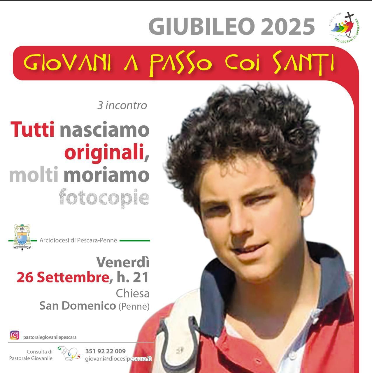 Si intitola “Tutti nasciamo originali, molti moriamo fotocopie” il terzo appuntamento del ciclo “Giovani a passo coi santi”, organizzato dalla Consulta diocesana di Pastorale giovanile dell’Arcidiocesi di Pescara-Penne, che domani sera (venerdì 26 settembre) alle 21 – nella chiesa di San Domenico a Penne – verrà dedicato alla figura di San Carlo Acutis, canonizzato lo scorso 7 settembre: «Il senso di questo appuntamento – spiega Federica Fiorda, coordinatrice della Pastorale giovanile diocesana – è far capire ai giovani che ognuno di noi si porta dentro un talento, un qualcosa di unico che, forse, devono ancora scoprire, ma qualsiasi cosa sia devono portarlo avanti fino in fondo. Devono saperlo usare per gli altri non, solo per la nostra vita».
