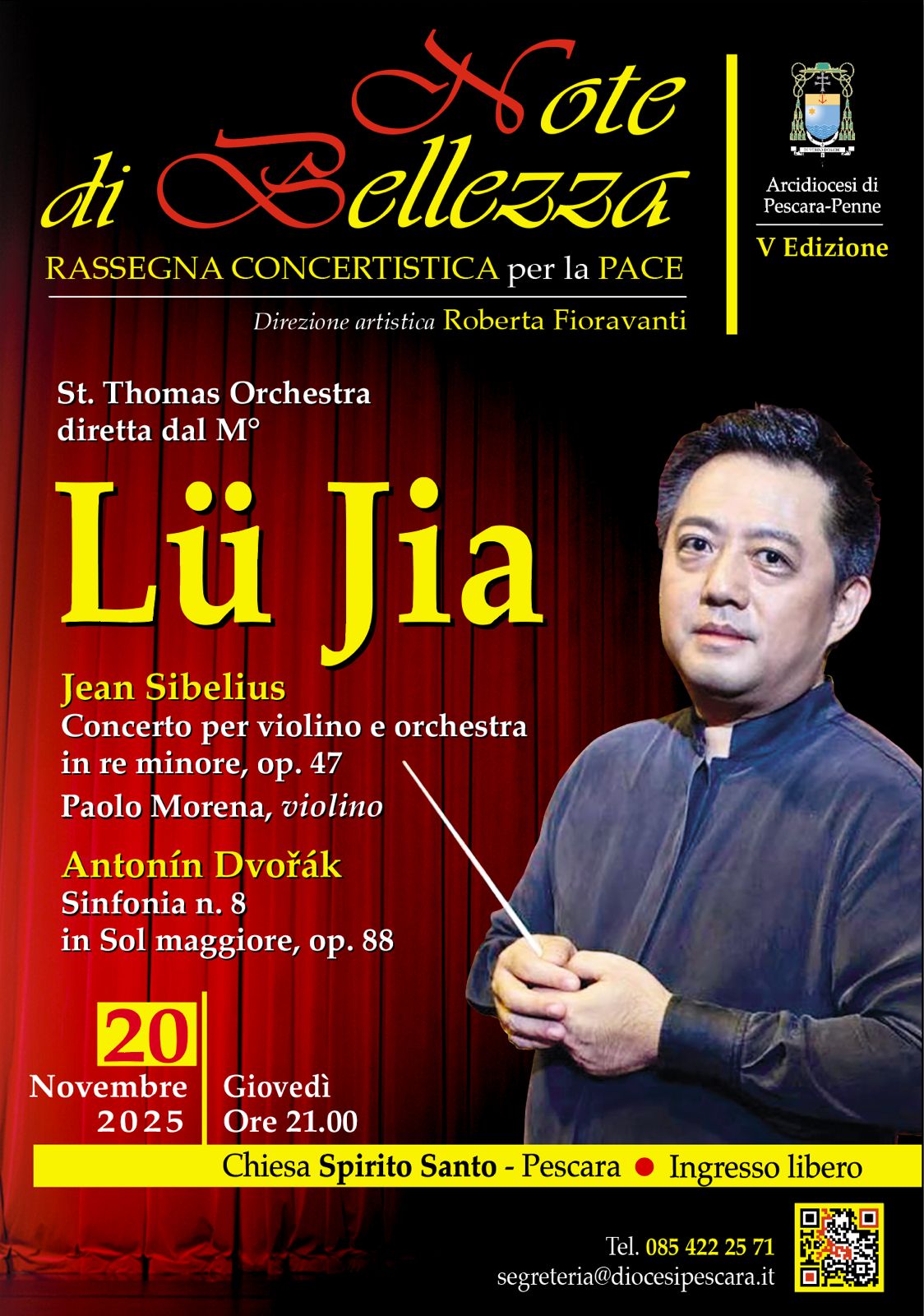 Giovedì 20 novembre 2025, alle 21 nella chiesa dello Spirito Santo a Pescara, sarà il concerto della Saint Thomas Orchestra diretta dal maestro Lü Jia (direttore della China National Center for the Performing Arts Orchestra) ad aprire la quinta edizione della rassegna concertistica “Note di bellezza. Rassegna concertistica per la pace”, promossa dalla Chiesa di Pescara-Penne su impulso dell’arcivescovo monsignor Tommaso Valentinetti.