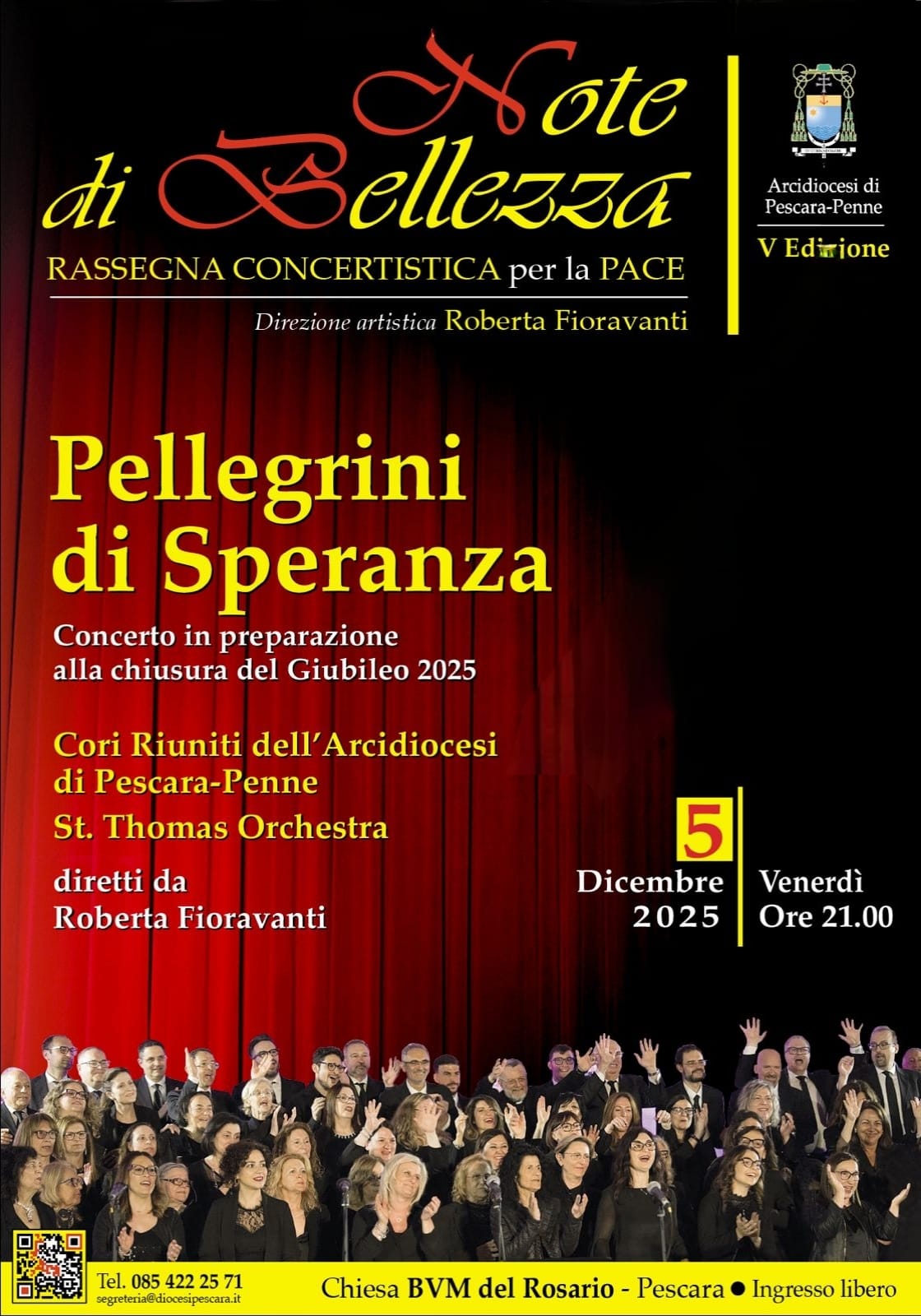 La Chiesa di Pescara-Penne chiuderà in musica in Giubileo ordinario 2025, con il secondo appuntamento della rassegna concertistica “Note di bellezza” che venerdì 5 dicembre alle 21 farà tappa nella chiesa della Beata Vergine Maria del Rosario in via Cavour a Pescara. Al centro della serata ci sarà il concerto, che proprio Giubileo riprenderà il tema “Pellegrini di speranza”, il quale vedrà esibirsi i Cori riuniti dell’Arcidiocesi di Pescara-Penne accompagnati dalla Saint Thomas Orchestra entrambi diretti da Roberta Fioravanti, la quale è anche la direttrice artistica della rassegna concertistica.