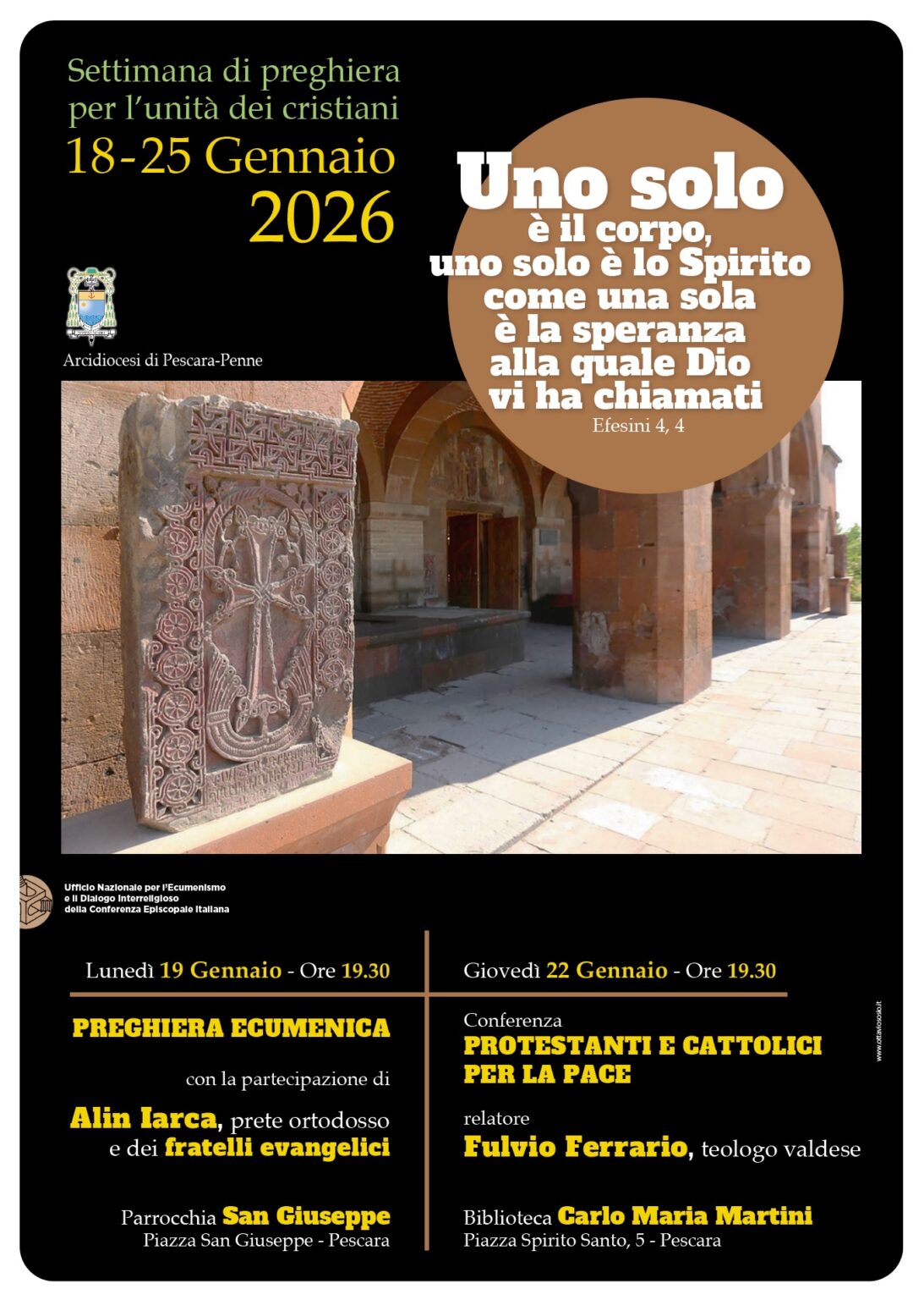 Inizierà domani la Settimana di preghiera per l’unità dei cristiani 2026, dal tema “Uno solo è il corpo, uno solo è lo Spirito come una sola è la speranza alla quale Dio via ha chiamati” (dalla lettera agli Efesini 4,4), che avrà luogo in tutta la Chiesa così come in quella particolare di Pescara-Penne da domenica 18 a domenica 25 gennaio.